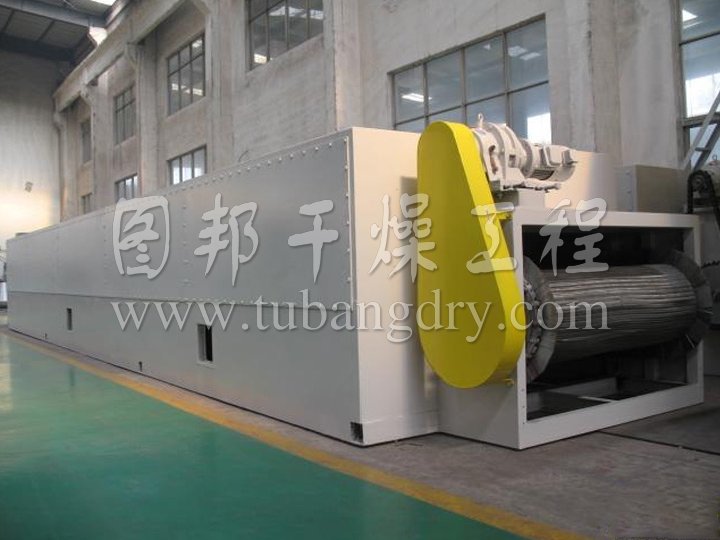 整個生產線為全封閉型(對物料而言),由擺動布料段、干燥段、出料段三部分組成。擺動布料段作用使海藻均勻分散在網板上,并且勻速輸送到干燥段,海藻經過80℃熱風干燥段,90℃熱風干燥段和120℃熱風干燥段后,再經過出料段排料。循環風向及各單元內風的循環為向下式,即加熱后的空氣由引風機吸入,在風機出風口首先預分布再經過孔板均風后,熱風從物料的下面向上(或從物料的上面向下)穿透物料層。