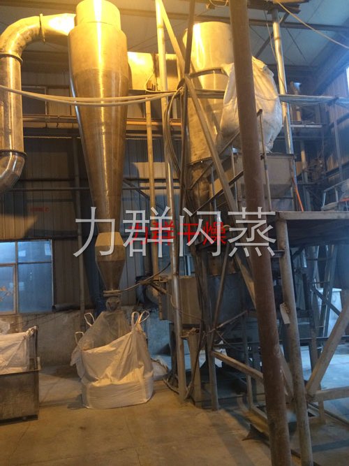 經(jīng)換熱器加熱后的潔凈空氣被鼓入進風(fēng)口,以適宜的速度旋入干燥室底部的環(huán)隙,然后按切線方向進入干燥室,并呈螺旋狀上升:同時,物料則由可無級調(diào)速的加料器定量加入塔內(nèi)。在干燥塔內(nèi),物料與熱空氣進行充分、高效的質(zhì)熱變換,被干燥的粉狀物料隨同熱風(fēng)一起輸送至分離器,其中成品收集包裝,而尾氣則進一步經(jīng)除塵裝置處理后排空。